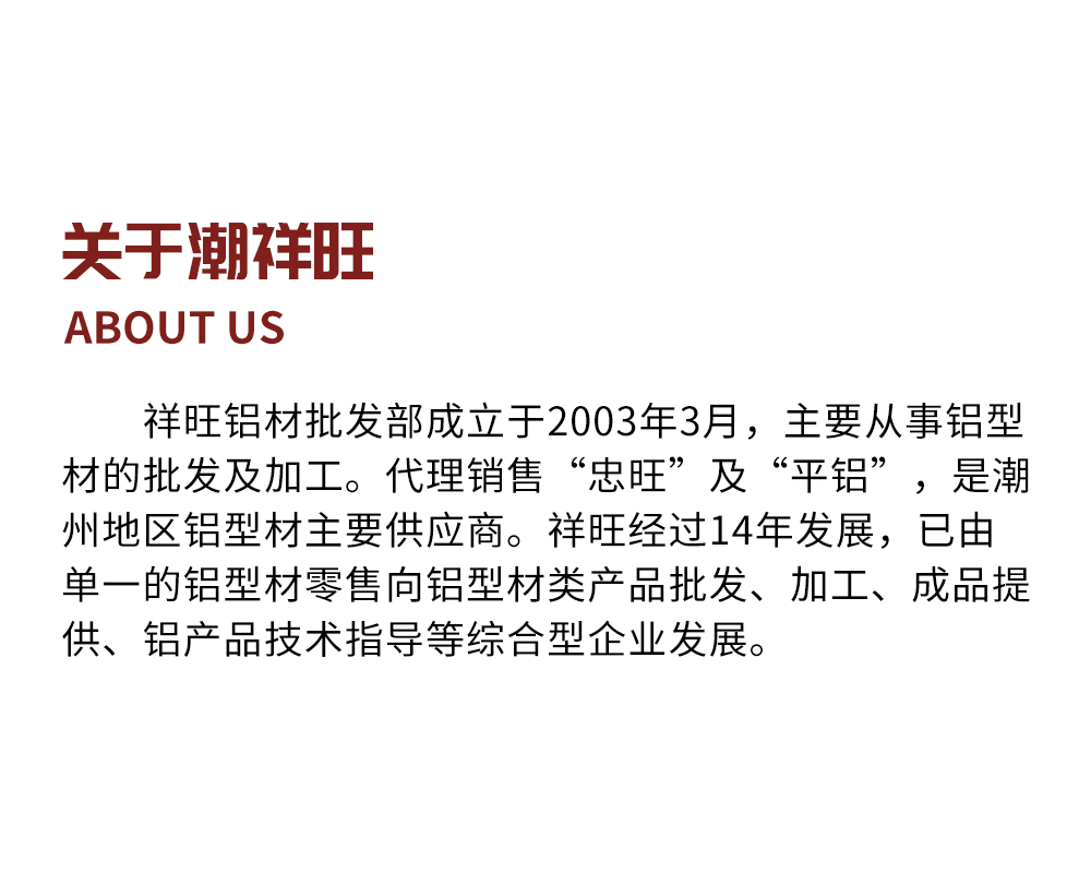 - 祥旺鋁材批發(fā)部成立于2003年3月,主要從事鋁型材的批發(fā)及加工。