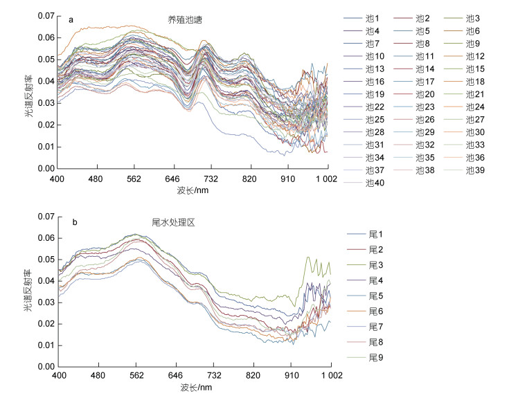 研究養(yǎng)殖小區(qū)共49個采樣點的光譜反射率曲線如所示, 其中圖列出了40個養(yǎng)殖池塘采樣點的反射率曲線,列出了9個尾水區(qū)采樣點的反射率曲線??梢钥闯龀靥了w的光譜特征在400~ 560 nm范圍內(nèi), 光譜反射率呈上升趨勢, 至560~ 580 nm附近形成一個反射高峰, 這主要是是由水體中葉綠素和胡蘿卜素在此波段具有較弱的吸收特點, 同時加上藻類和懸浮物的散射作用而引起反射高峰。而到580 nm后, 反射率曲線呈下降趨勢, 直至680~710 nm處附近則形成一個峰谷, 主要是由于水體中的葉綠素a在此波段具有強吸收的特點); 而緊接著在790~810 nm范圍內(nèi)形成一個峰值, 主要是由于水中懸浮物的散射作用。而尾水處理區(qū)由于經(jīng)過過濾、沉淀、曝氣等凈化過程, 水體中懸浮物和藻類去除率可達到70%以上, 因此, 尾水處理區(qū)在680~710 nm和790~810 nm范圍內(nèi)均未形成明星的峰值, 而其他波段的變化規(guī)律和養(yǎng)殖池塘具有一致性。綜合分析光譜曲線可知, 不同池塘水體的光譜曲線變化趨勢總體一致, 但是由于不同采樣點具有不同的水質(zhì)指標濃度, 導致其峰谷值及曲線高低變換存在一定差異。