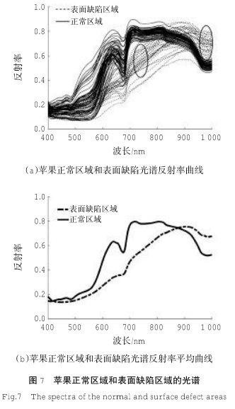 蘋果樣本高光譜圖像經(jīng)過MNF變換后的前15個(gè)波段對(duì)應(yīng)的特征值均大于1.4,且前15個(gè) MNF成分累積百分比超過95.25名,進(jìn)而選取前15個(gè)MNF成分圖像進(jìn)行反向MNF變換,有效地解決了蘋果高光譜圖像中存在的噪聲。完好無損和表面有缺陷蘋果的高光譜圖像的光譜反射率值在700nm~800nm以及900nm~1000nm波段范圍內(nèi)具有明顯的差異,選取717.98nm處的光譜反射率值小于0.6以及982.59nm處的光譜反射率值大于0.52作為區(qū)分蘋果正常區(qū)域和表面缺陷區(qū)域的閾值條件,通過閾值分割方法識(shí)別出表面有缺陷的蘋果,該檢測(cè)方法對(duì)80個(gè)完好無損蘋果和40個(gè)表面有缺陷蘋果的正確識(shí)別率分別為97.58%和95%。實(shí)驗(yàn)結(jié)果為開發(fā)蘋果表面缺陷在線快速檢測(cè)系統(tǒng)提供基礎(chǔ)。